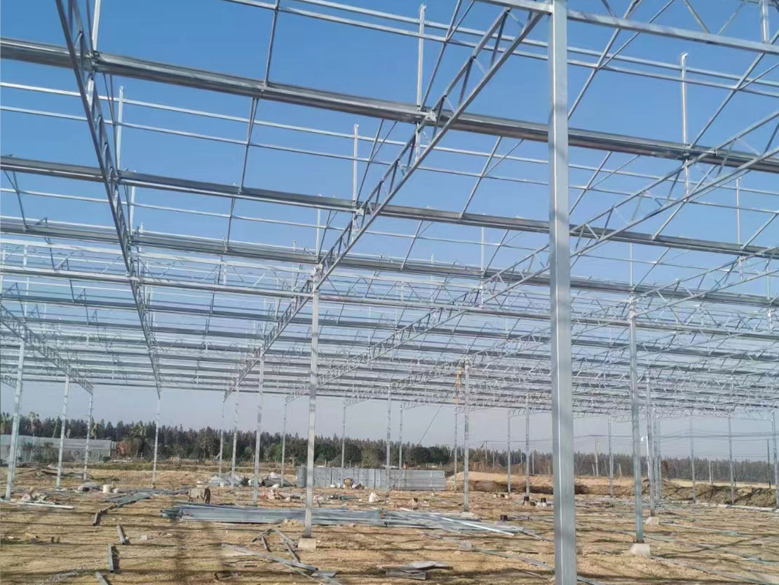 该类温室采用先焊接后热镀锌钢制骨架,覆盖材料为国产浮法玻璃,其透光率>97%。温室顶部及四周为专用铝型材。